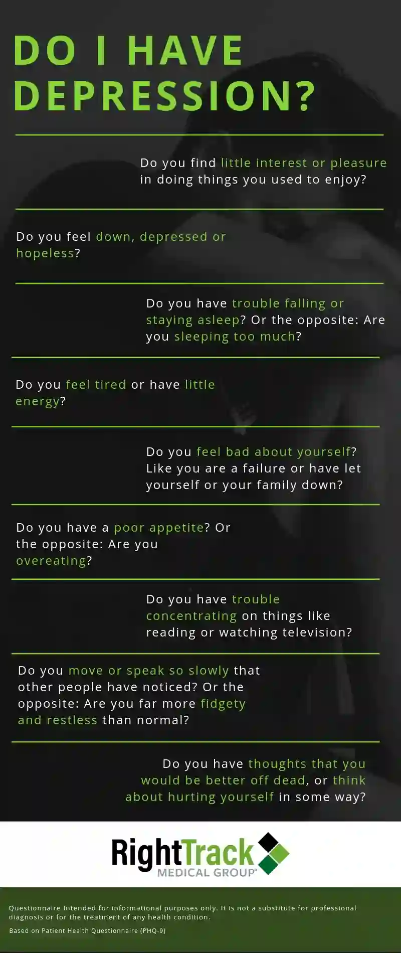 This is a screening measure to help you determine whether you might have depression that needs professional attention. This screening tool is not designed to make a diagnosis of depression but to be shared with your primary care physician or mental health professional to inform further conversations about diagnosis and treatment.