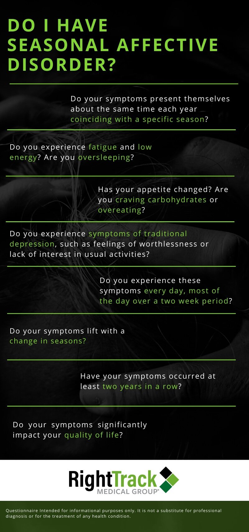 “If you believe you might have major depression with a seasonal pattern, begin to pay attention to patterns and track your symptoms.”